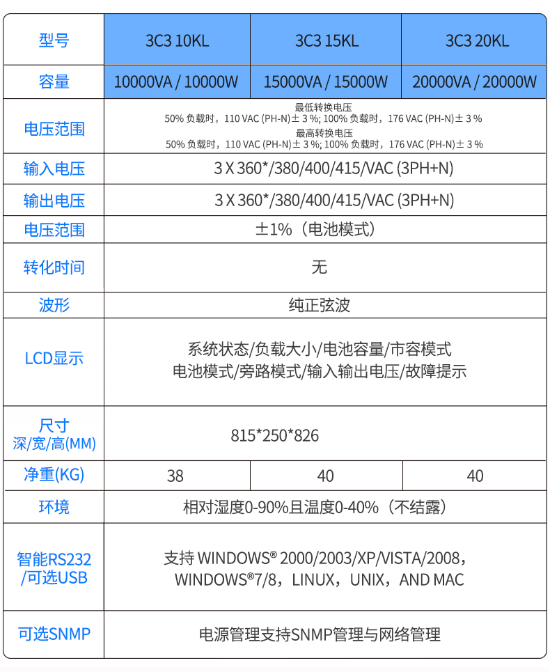 輸出功率:10KVA/10KW、15KVA/15KW、20KVA/20KW